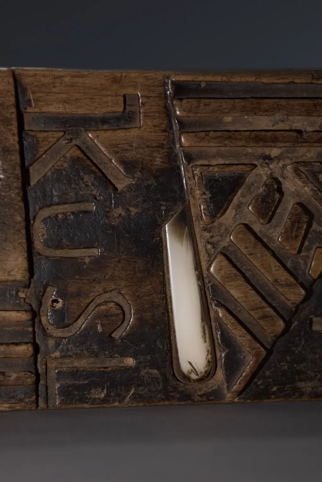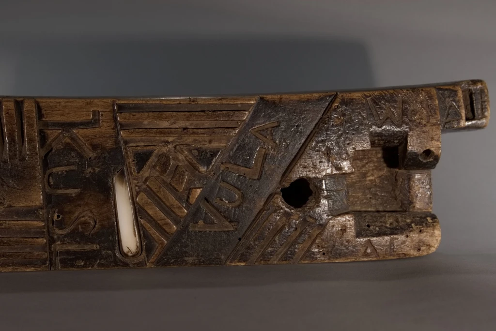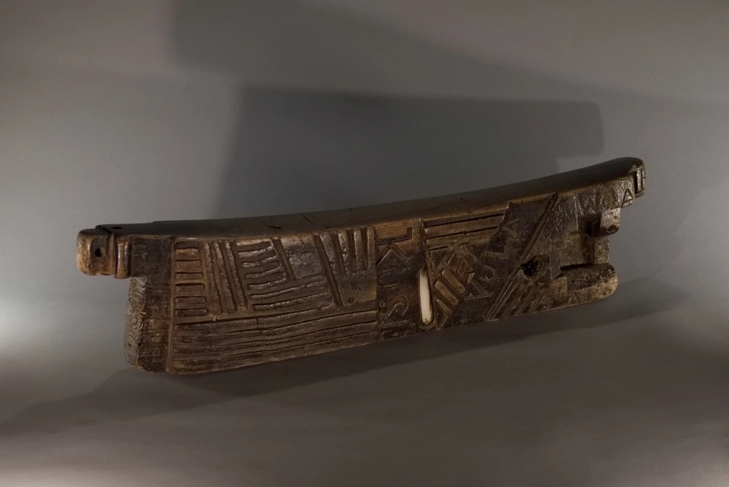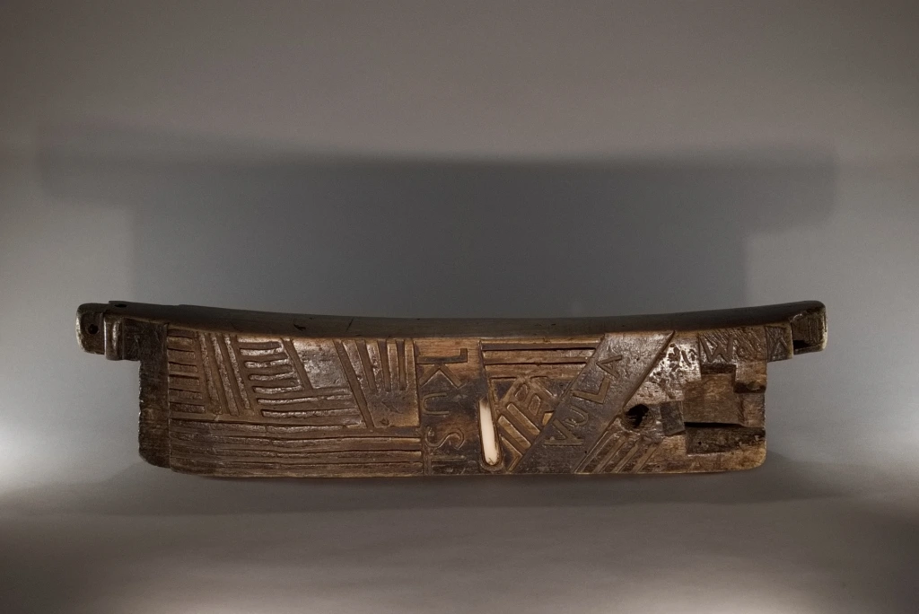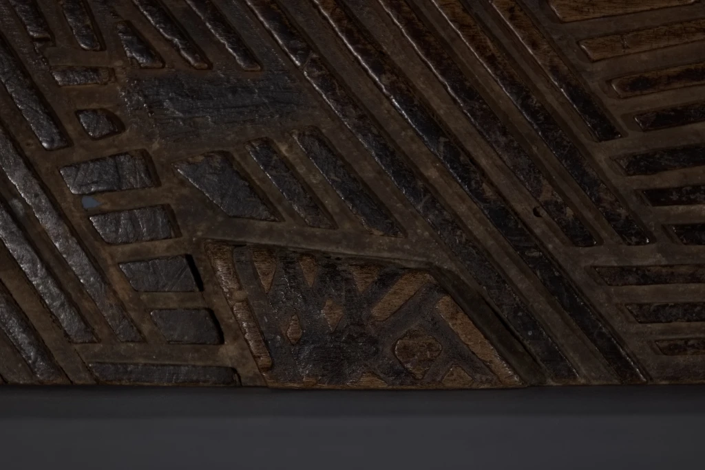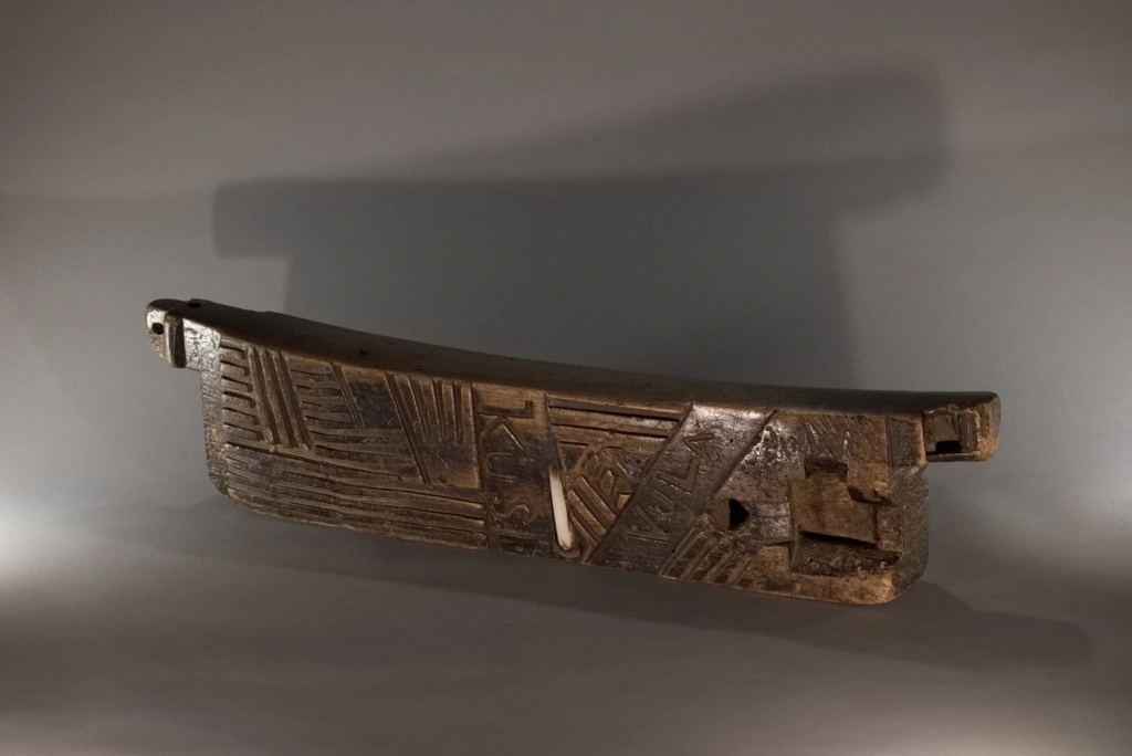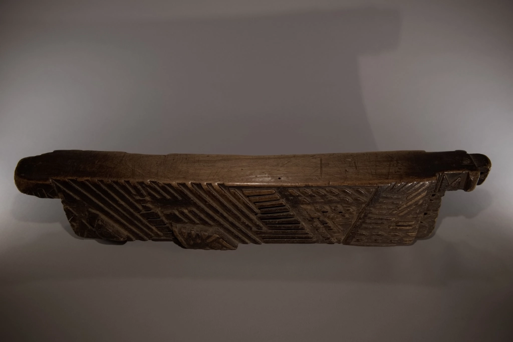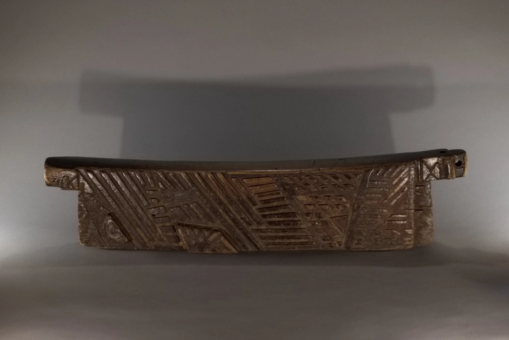 Cet appuie-tête, ayant appartenu à Alex Zaloumis, est totalement atypique et fourmille de particularités : • Sa taille exceptionnelle de 75 cm et sa légèreté sont les premières surprises. • Ses décorations mêlent le style zoulou et le style swazi du XIXᵉ siècle, à l’image de la pièce S065 de la collection Swazi. • Des lettres et inscriptions mystérieuses figurent sur l’objet. • Le manche en bakélite blonde d’un canif est incrusté dans l’appuie-tête. • Enfin, des engravures étonnantes apparaissent sur l’extrémité d’une face. Toutes ces originalités font de cet appuie-tête une pièce majeure dans toute collection.