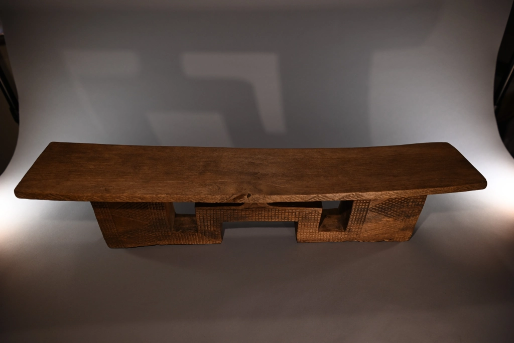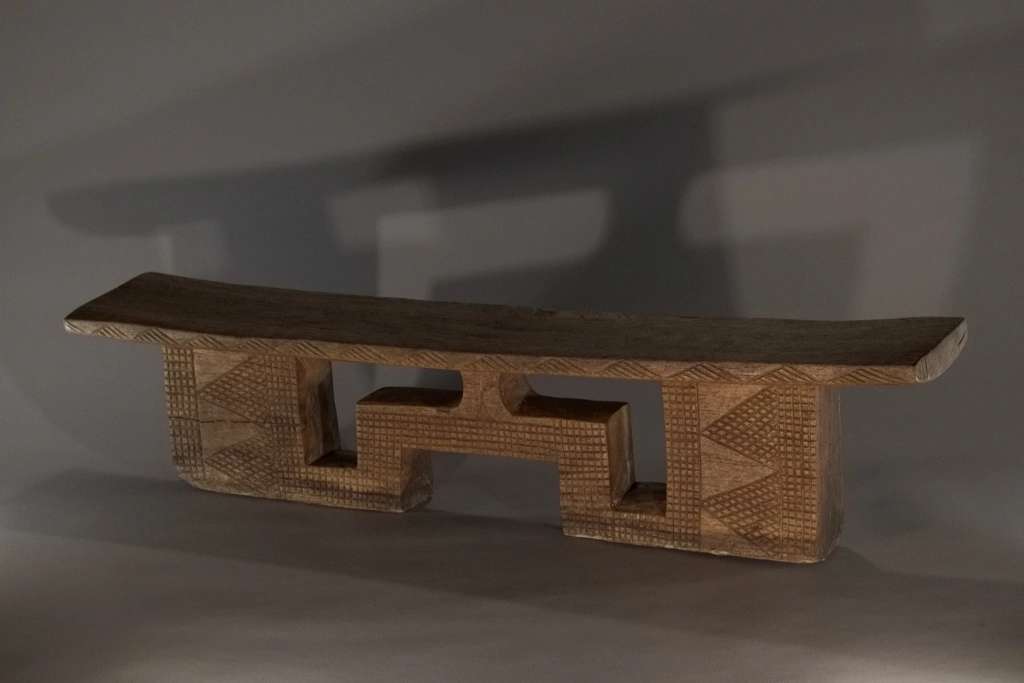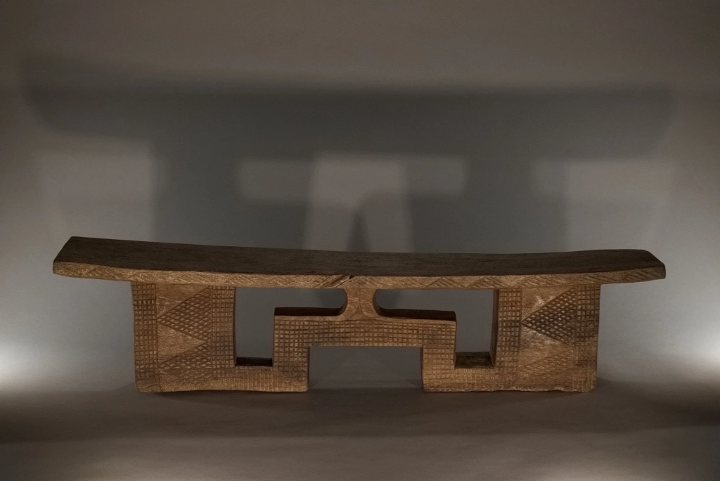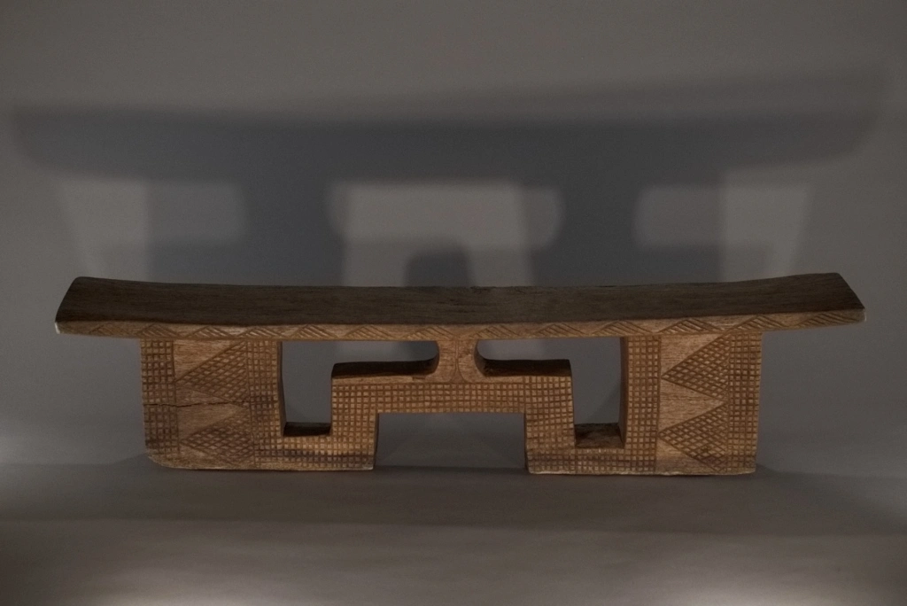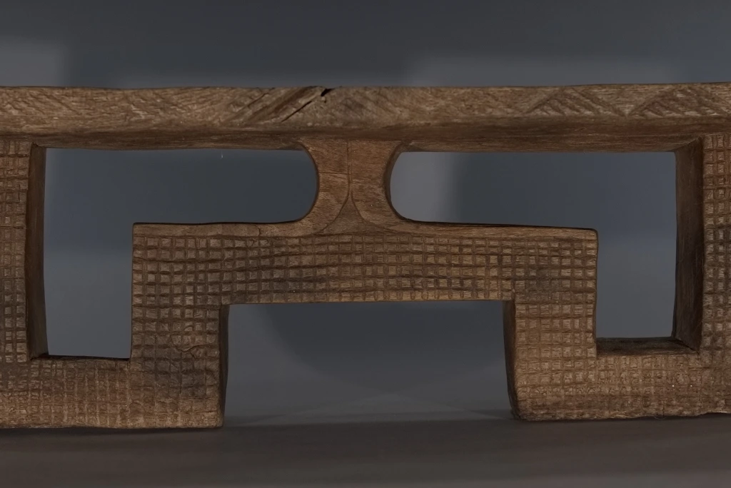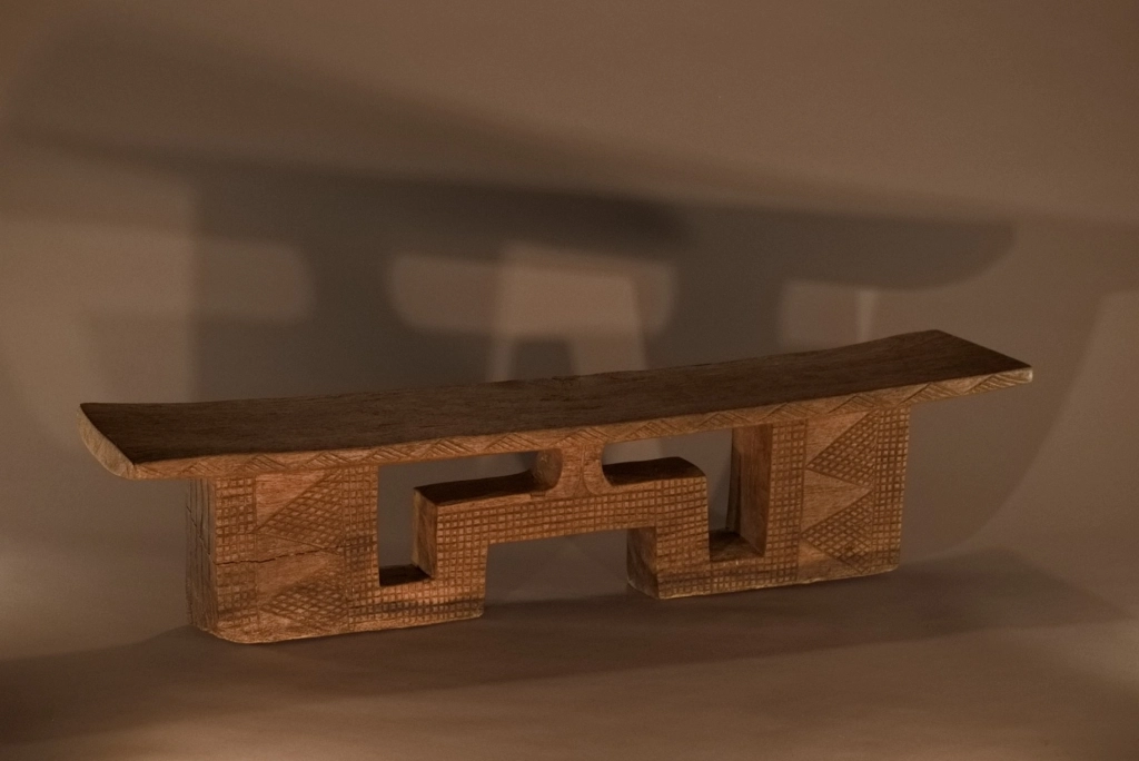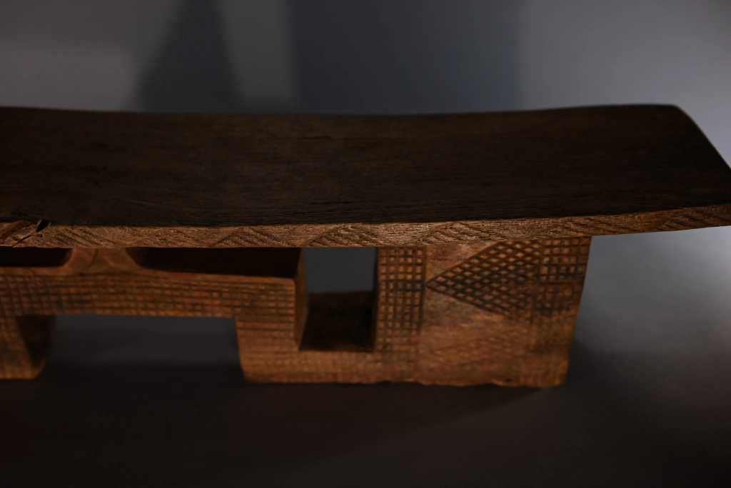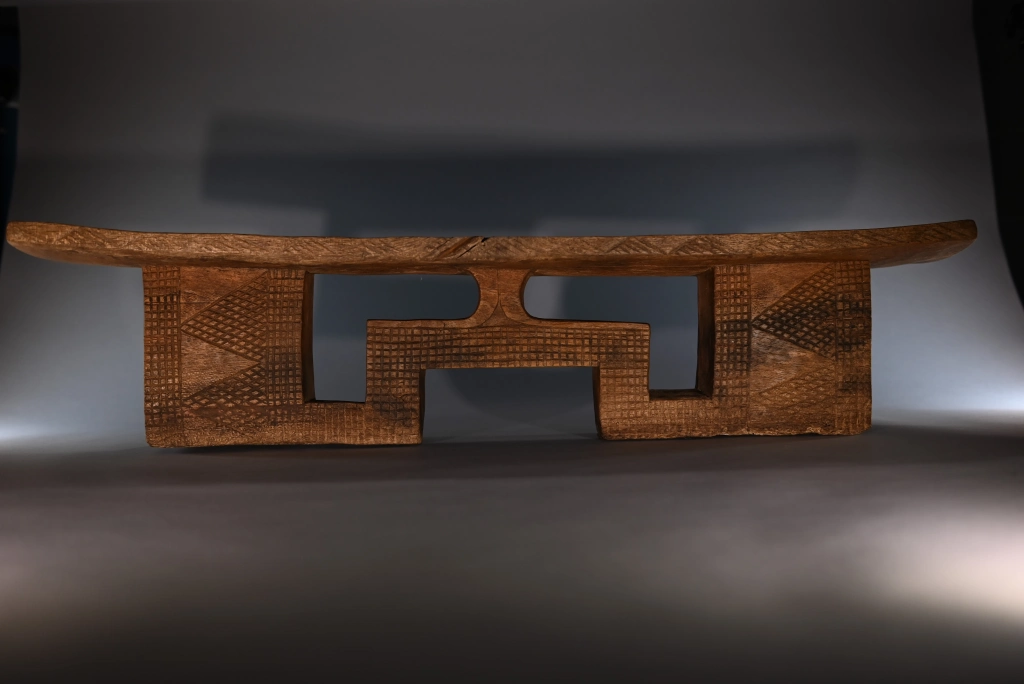 Pièce à double usage tabouret-appui-tête, mais sculptée avec les caractéristiques typiques d’un appuie-tête, aussi bien en termes de forme que de décoration. On peut considérer qu’au-delà de 16 cm, l’utilisation de ce type d’appuie-tête s’accompagne d’un rehaussement du dormeur sur une natte épaisse ou un fin matelas. Le bois clair met en valeur les ciselures de la pièce, offrant un contraste harmonieux qui sublime son esthétique.