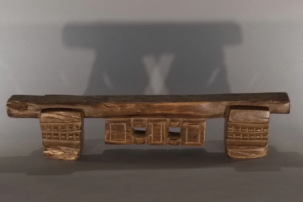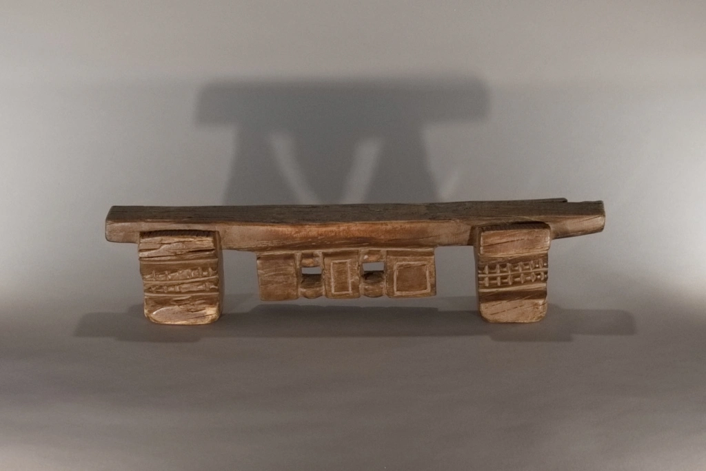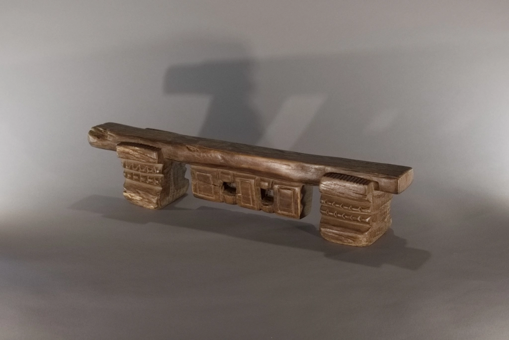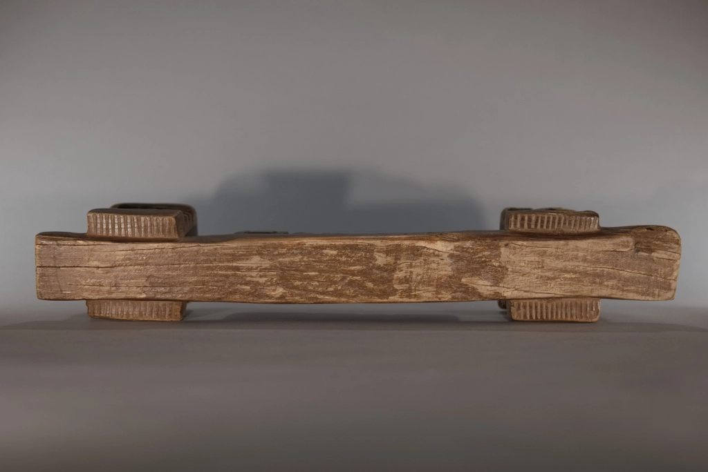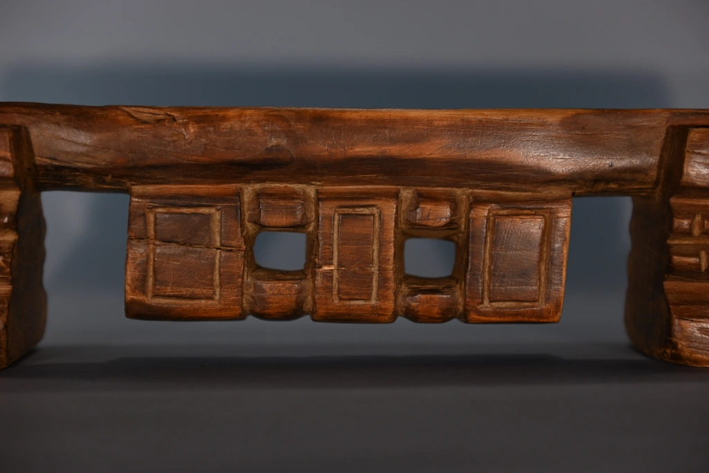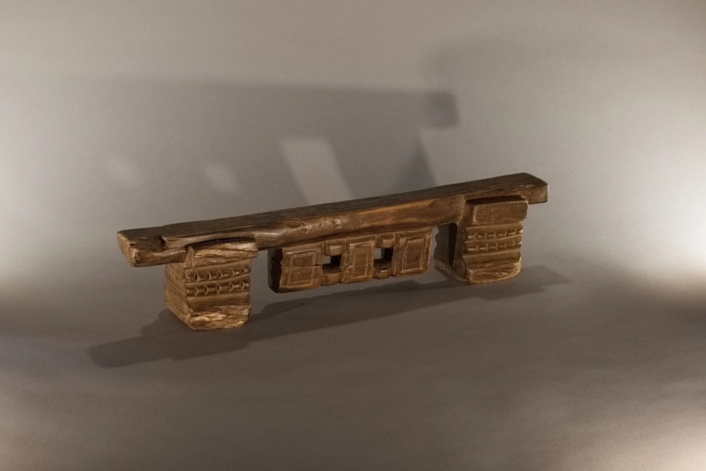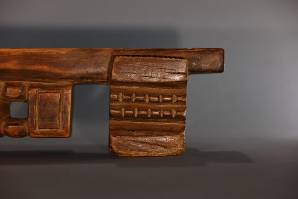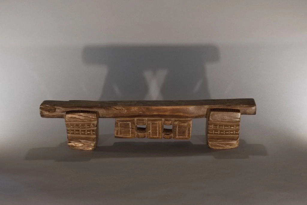 Pièce marquée par le temps : chocs, coups, parties rongées par l’usure lui confèrent un cachet particulier, témoin de son long parcours à travers différents propriétaires depuis un siècle. Sculptée dans les années 1920 par un artiste inconnu, elle présente deux pieds traditionnels, associés à une partie beaucoup plus originale en suspente au milieu de la barre d’appui. Une pièce de caractère, aussi intrigante qu’attachante.
