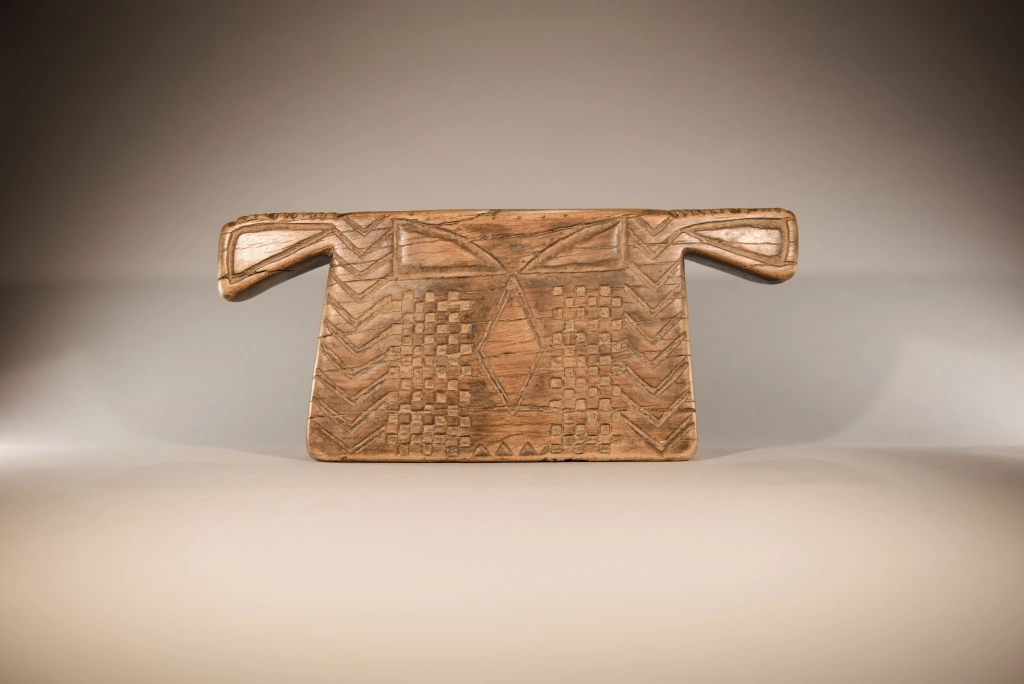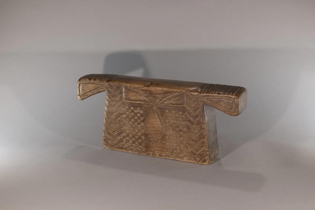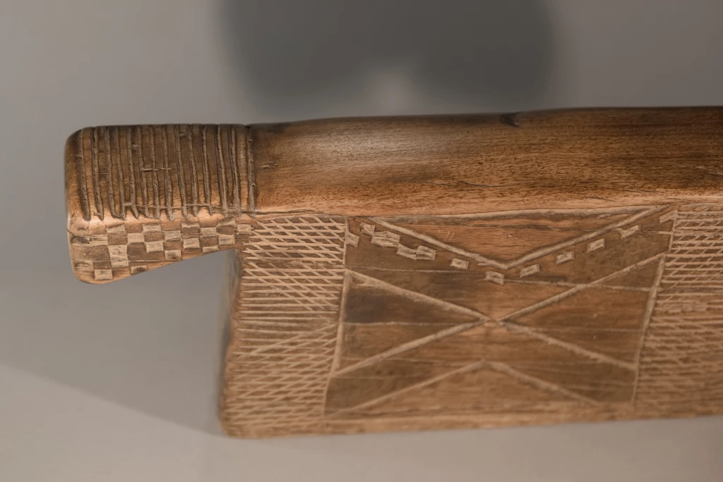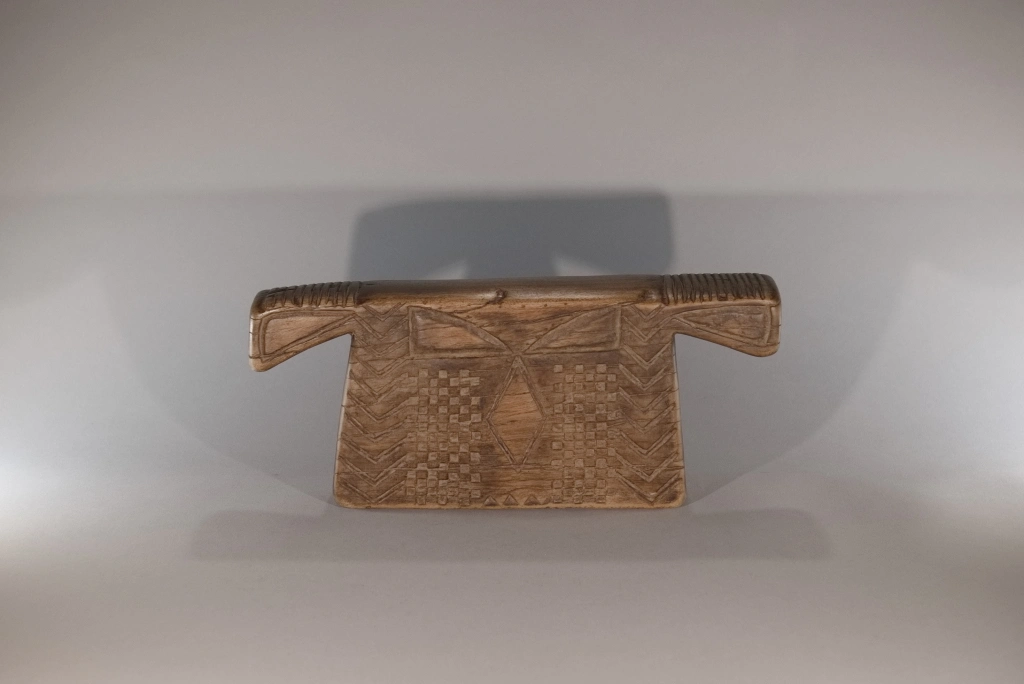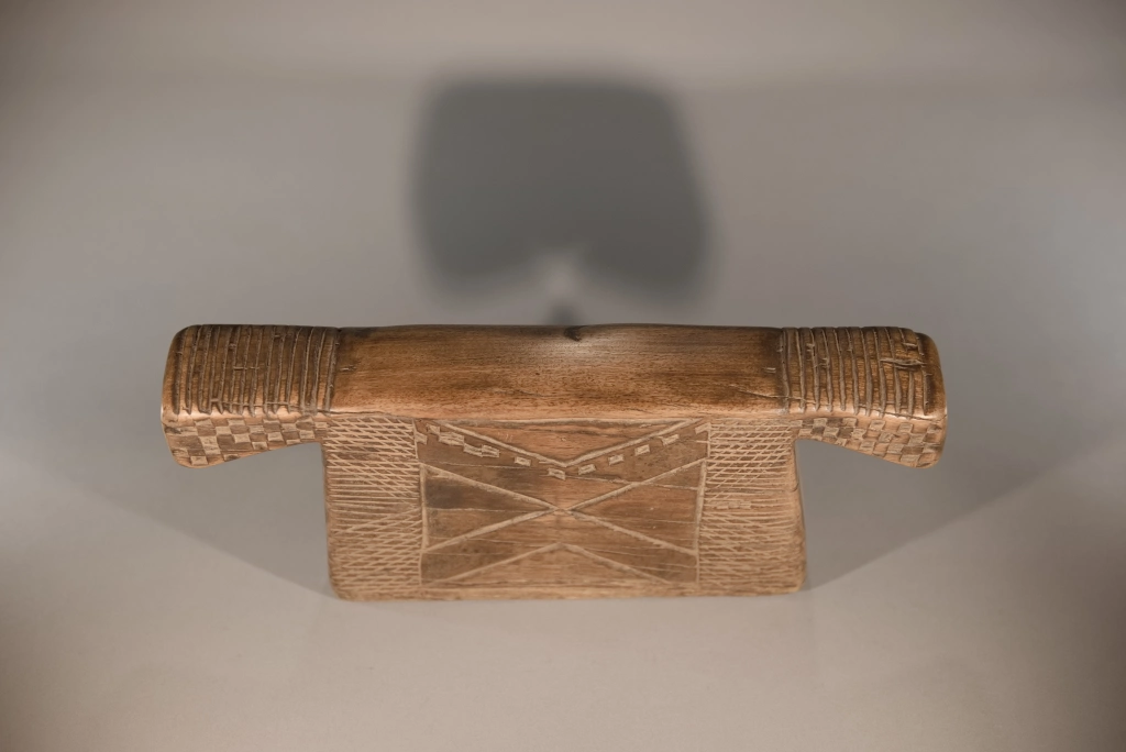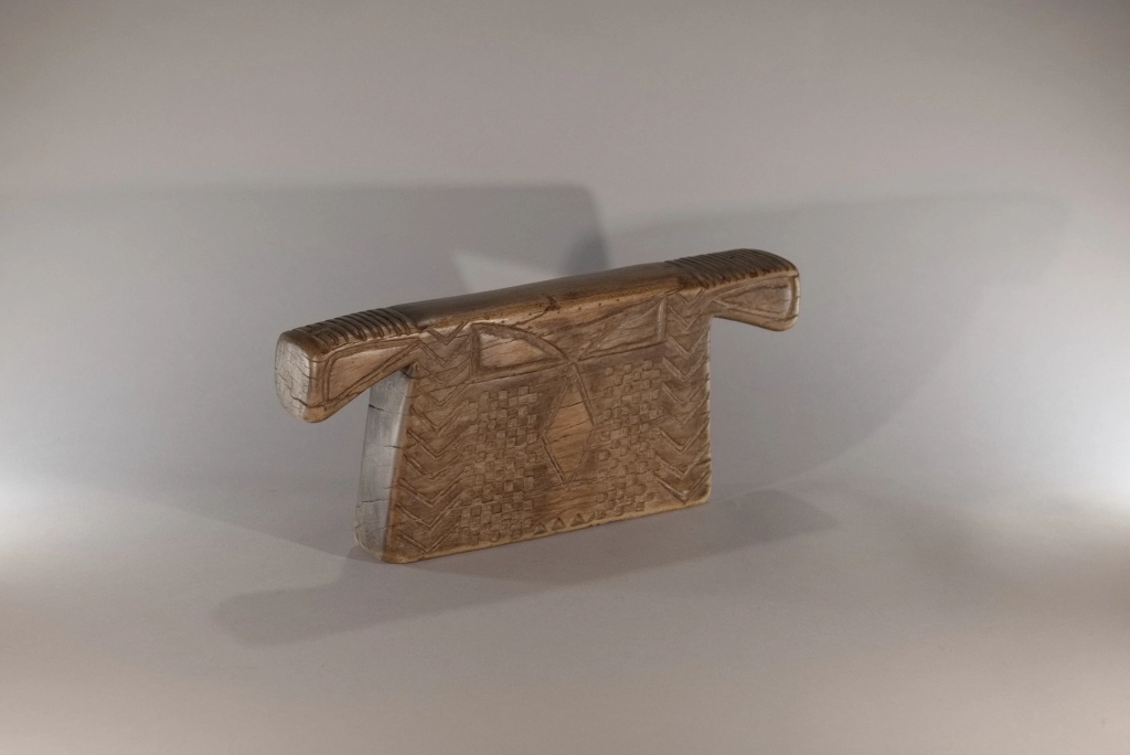 Un appuie-tête de type « porte-manteau « , dont la forme ramassée évoque les kimonos japonais. Ayant servi plus d’un siècle, il porte les marques du temps : fissures et craquelures viennent compléter une décoration déjà très esthétique. Son corps massif contraste avec ses deux bras atrophiés, finement décorés de pokerwork, ajoutant une touche d’originalité à cette pièce au caractère unique.