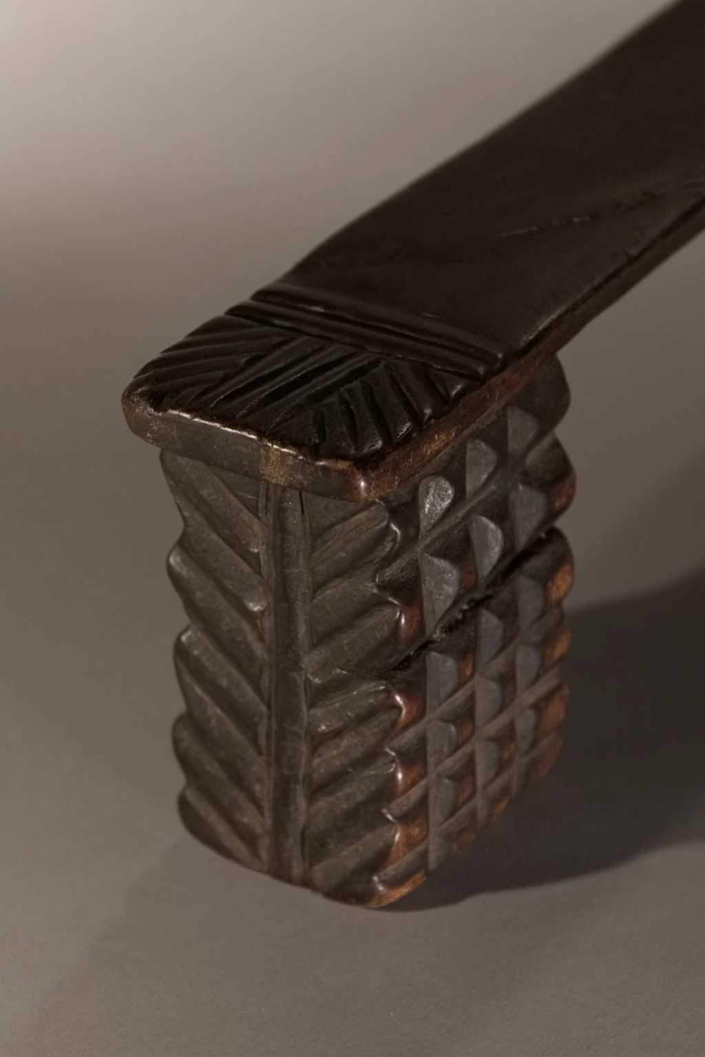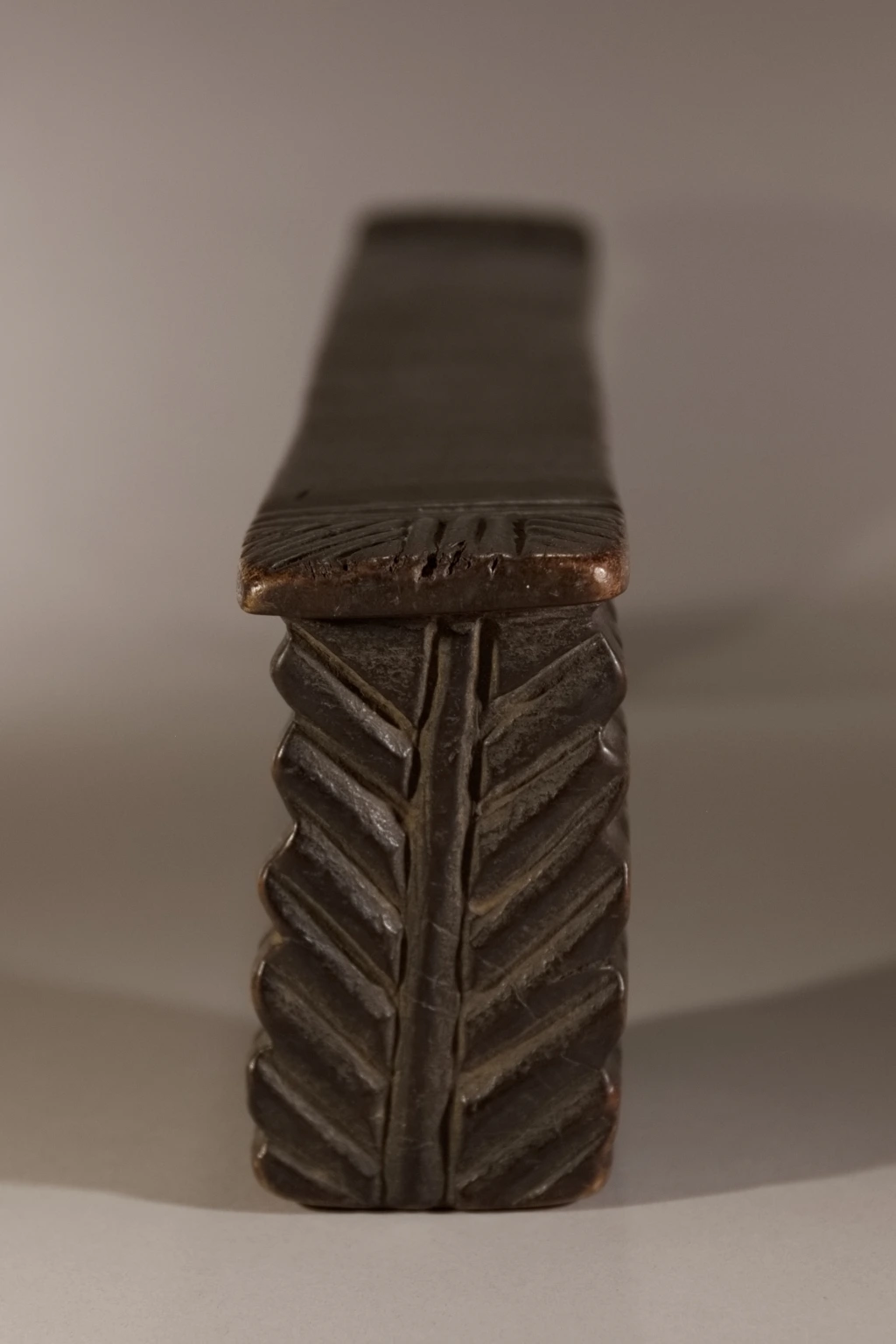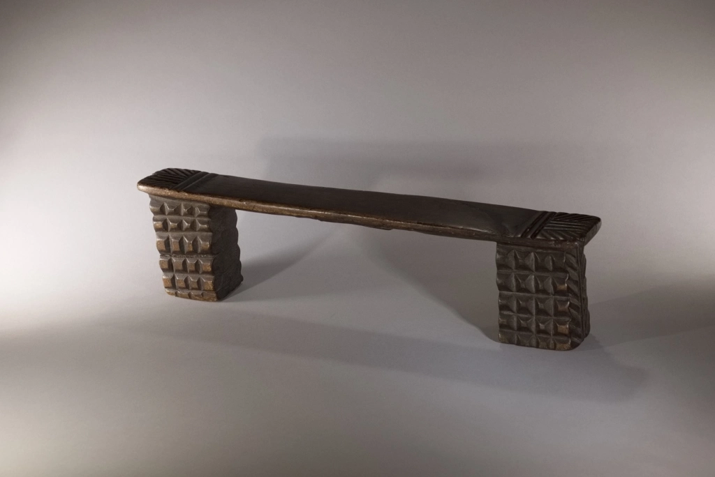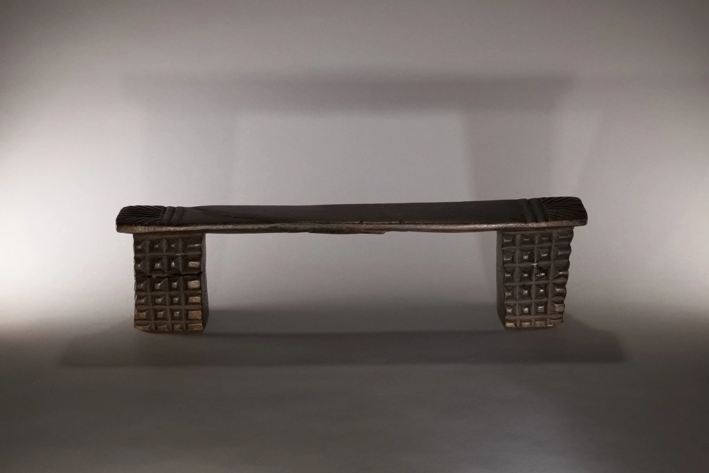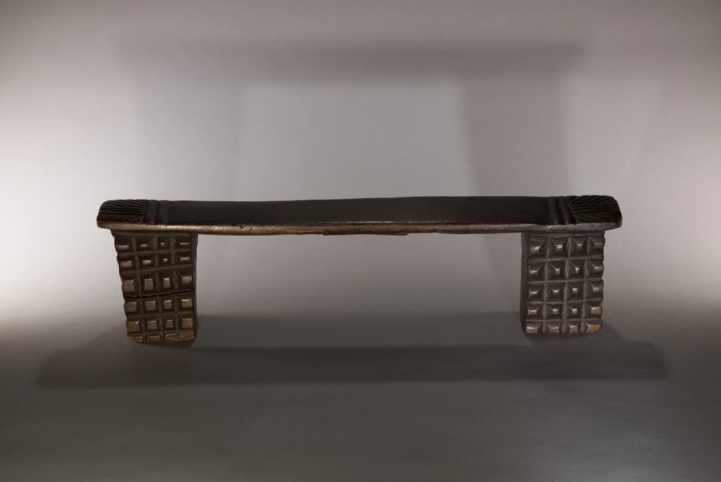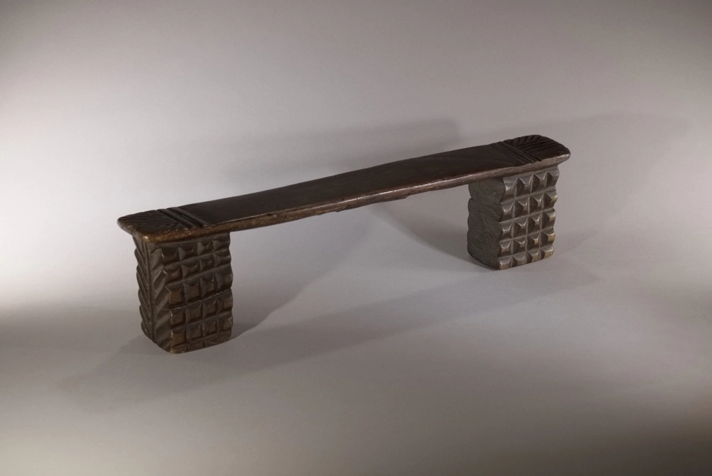 Cet appuie-tête adopte la forme la plus traditionnelle chez les Zoulous : deux pieds sculptés avec un amasumpa profond, reliés par une fine barre d’appui. Sa particularité réside dans sa cassure et sa réparation : il a été fracturé d’un violent coup de masse sur la barre d’appui au décès de son propriétaire, une pratique visant à l’enterrer avec le défunt dans sa sculpture. On peut supposer qu’un membre de la famille a souhaité le récupérer et le réparer en souvenir du défunt. Revenu de l’au-delà, cet appuie-tête témoigne des successions de générations zouloues et du lien profond qui unit les vivants à leurs ancêtres.