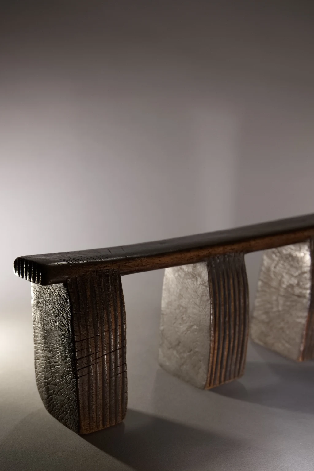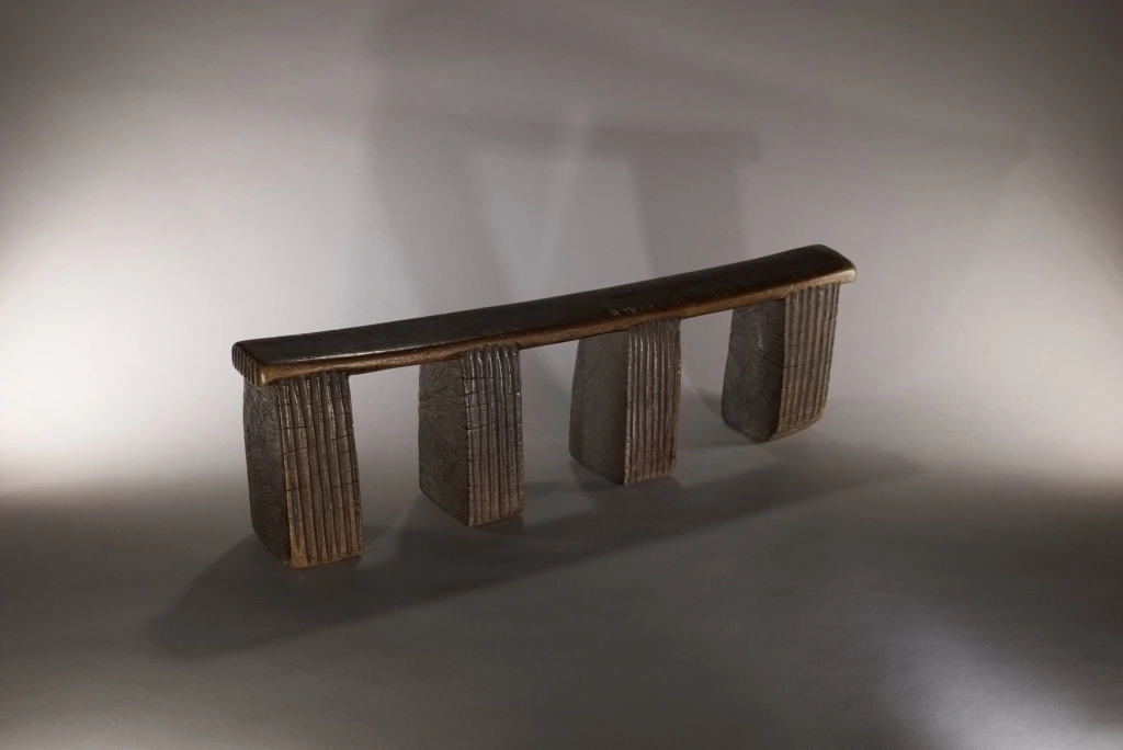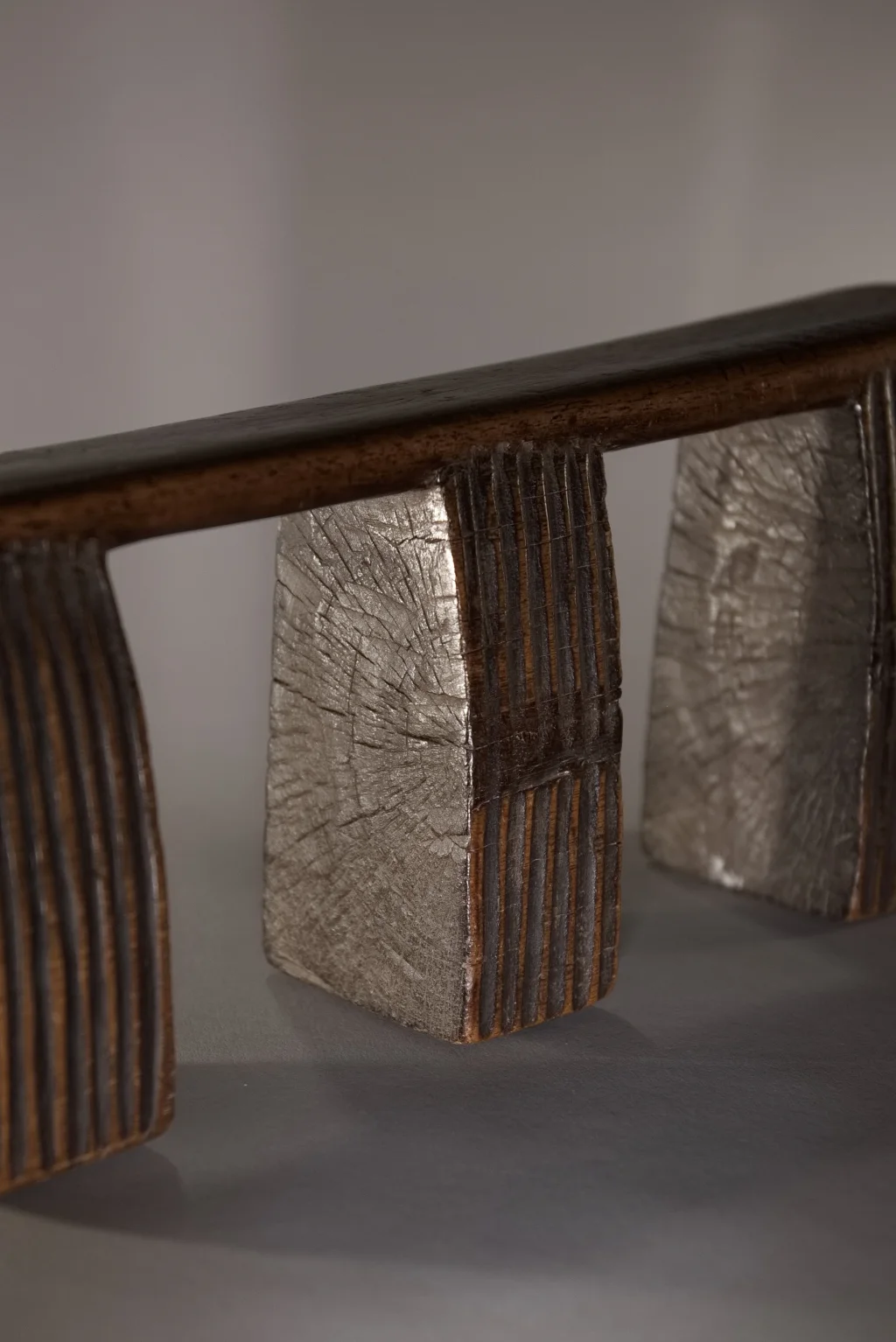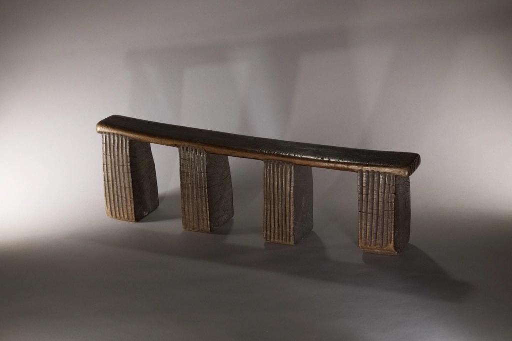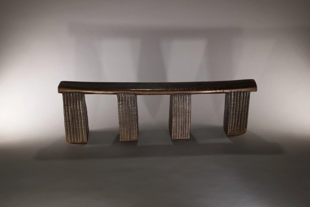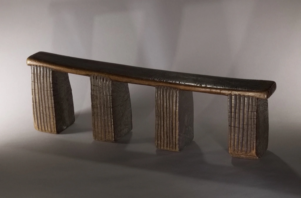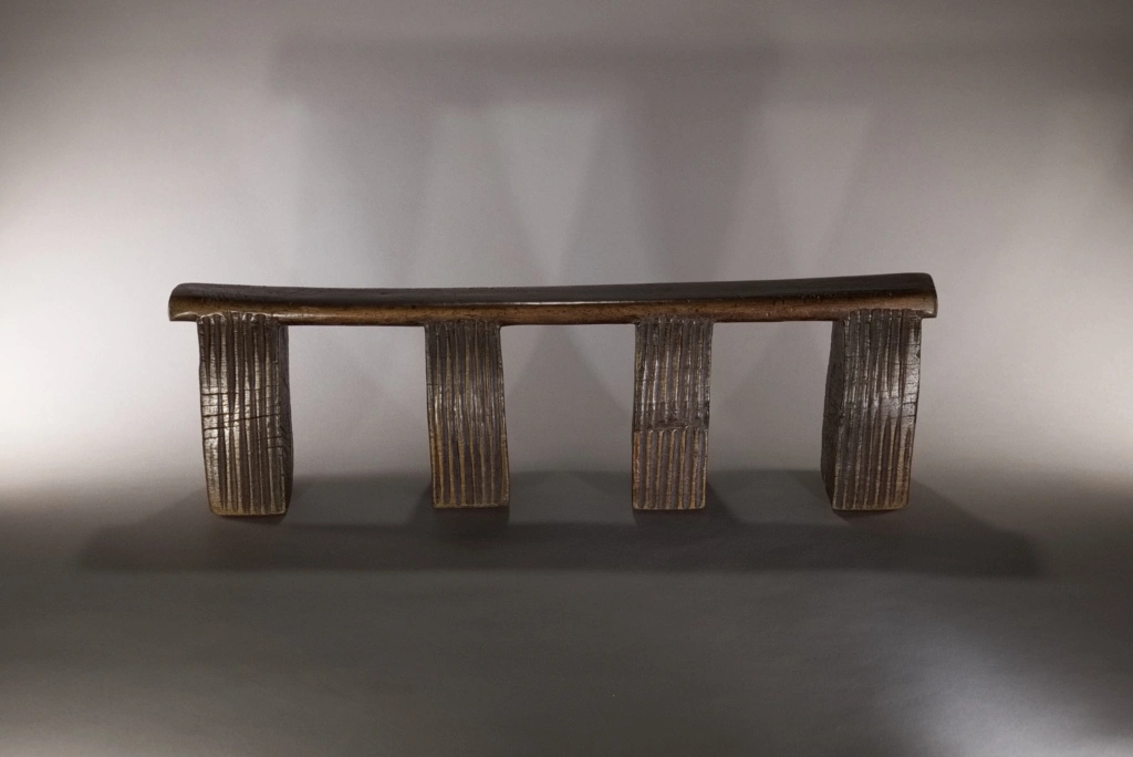 Un appuie-tête extrêmement élégant. Sa longue et fine barre d’appui repose sur quatre pieds légèrement enflés, ornés de stries d’un style zoulou/swazi. Les appuie-têtes à quatre pieds ne sont pas fréquents, mais c’est avant tout l’esthétique raffinée et la qualité d’exécution du sculpteur qui confèrent à cette pièce tout son caractère.